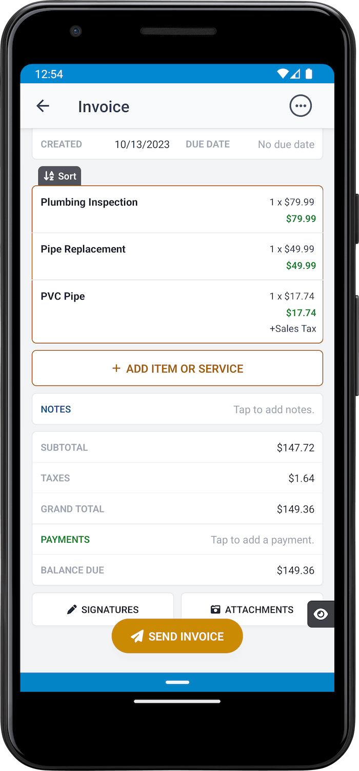 Whether you're sending an estimate or invoice, you'll be able to customize it exactly how you need. With ProBooks, you can add notes for your client, set a due date, attach photos, collect signatures, setup discounts, track payments, and more.